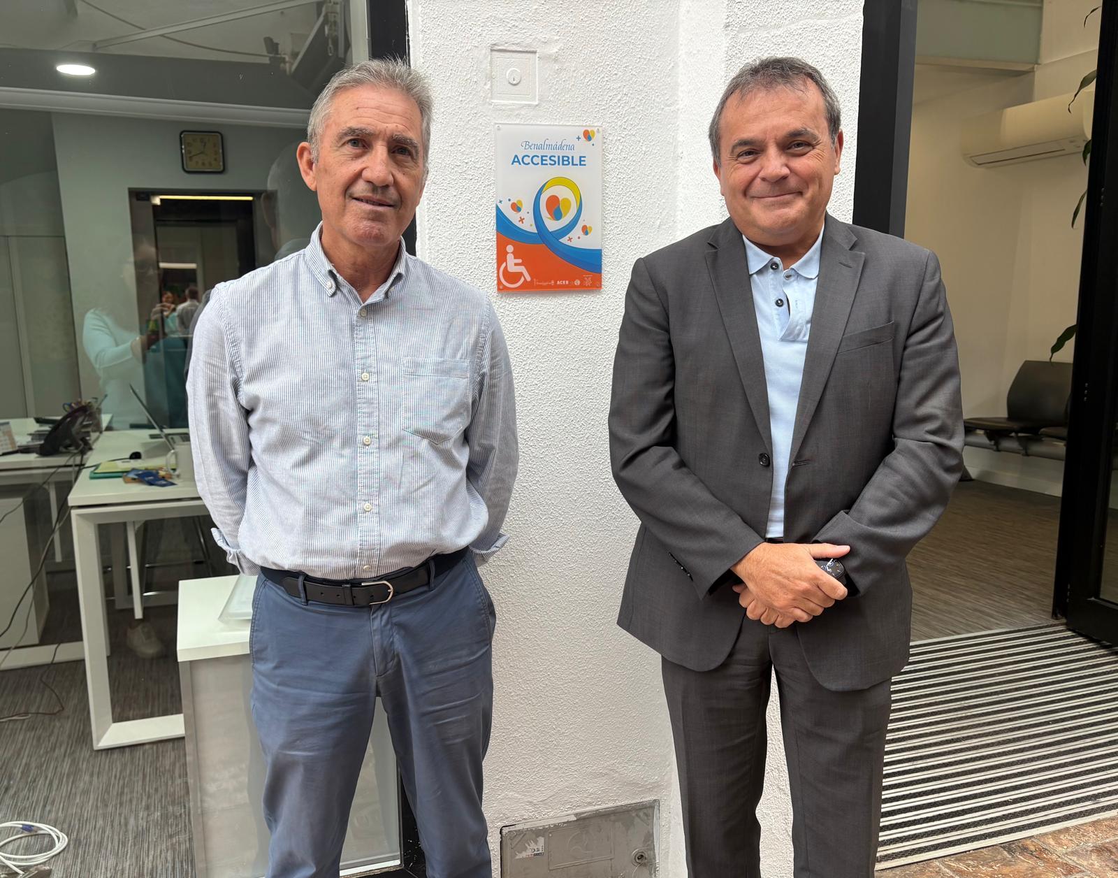 Jesús Fortes Ruiz fundador de Fortes & Rodríguez han recibido de manos del presidente de la ONG Paraocio Jorge Román la placa de reconocimiento por cumplir con las normas que facilitan el acceso a todas las personas con movilidad reducida determinadas en la campaña Benalmádena Accesible junto al Ayuntamiento y la ACEB.